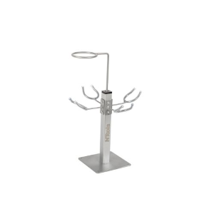 Supporto per 4 pistole a spruzzo. La parte superiore è dotata di un supporto girevole per sostenere il filtro durante il riempimento del contenitore con vernice o base. La sezione centrale dispone di quattro supporti gommati per fissare le pistole tramite la tazza. La base inferiore, dotata di fori, consente di fissare il supporto su superfici come un tavolo.