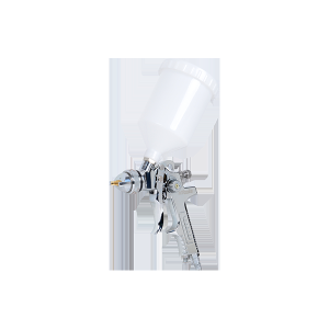 Pistola a spruzzo con tazza superiore in nylon, ideale per l'applicazione di fondi, primer, smalti acrilici, poliuretanici e trasparenti. Grazie alle caratteristiche dell'ugello e al basso consumo di aria compressa, è versatile e ideale per molteplici applicazioni in ambito produttivo e di manutenzione.