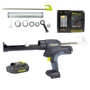 Pistola a batteria per applicazione di sigillanti leggera e dotata di illuminazione a LED, è compatibile con cartucce fino a 310ml e sacchetti fino a 600ml. Gli accessori includono un ugello dosatore e adattatori. Dotata di regolazione della velocità di materiale per creare diverse strutture superficiali.