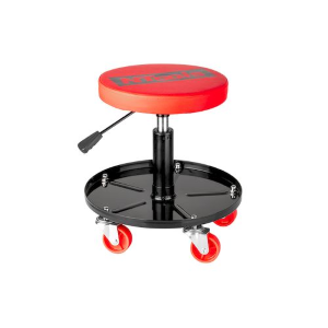 Sedile mobile girevole con regolazione pneumatica dell'altezza e spazi porta utensili. Telaio antiruggine con 5 ruote e seduta imbottita per maggiore comfort. Ideale per officini e carrozzerie, capacità di carico massima 120 kg.